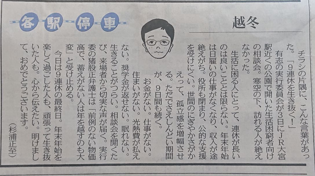 県庁の9連休が終わりました。⇩📷心に沁みる記事を、昨日(日)東京新聞さんが書いて下さいました(😭)。🎍正月3日の屋外での『食糧配布・弁護士無料相談会』は、複数の新聞記者さんも寒い中、長い時間、相談の声にも傾聴(取材許可頂いた方だけ)していました。後から後からご相談が寄せられるので、記者さんはいつ帰ろうか迷っていらっしゃいました。ありがとうございます😌。