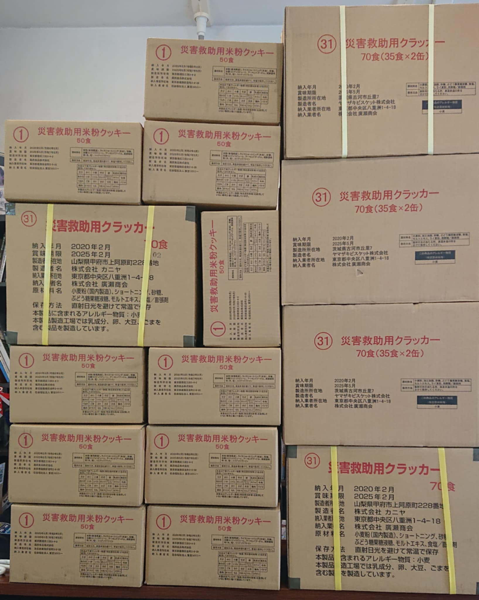 食糧支援の活動をしていると、📷写真のように『被災地』は身近に感じられます。(備蓄用だった食品です)