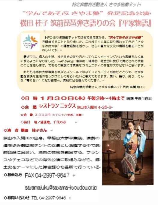 狭山市での琵琶上演。“学んであそぶ さやま塾”発足記念公演