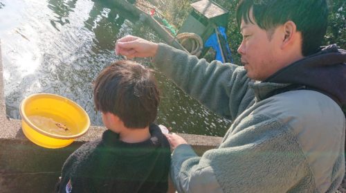 ヘラブナ釣りの脇に、『親子』釣り場が。📷️写真はパパさんが🐠釣り上げた瞬間で、👦お子さんに見せているところ。イイ風景なのです😌。