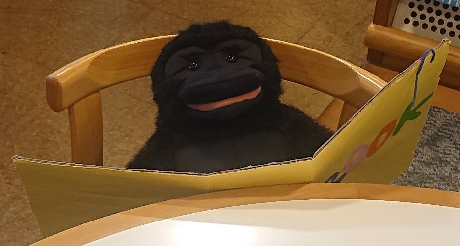 ゴリラ(のぬいぐるみ)が図書館で本を読んでいました(^^)。