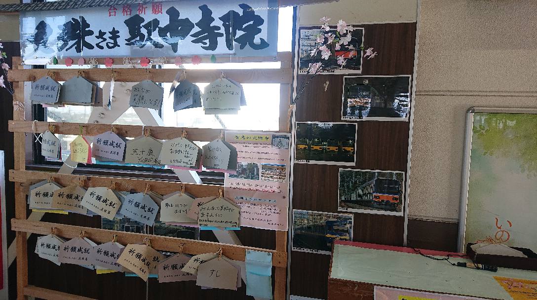 絵馬の中で「すし」って書いてあって、『受験終わったら食べたいのね』って(^O^)笑いました。 (改札前。右下に「すし」(^O^))