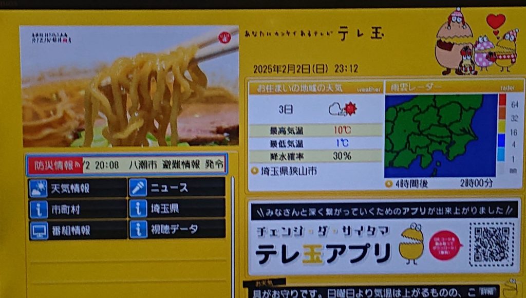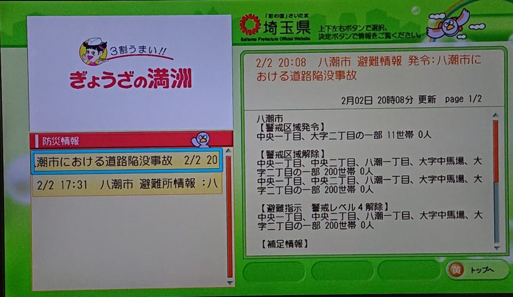 コロナ禍3年間のTVによる県庁の情報の出し方に課題があり、県庁が出資している📺️TV埼玉で働いている県庁OBに1月初旬にも言い、現在は『下水道陥没』についての情報を『データ放送画面』で表示するようになりましたが、📷このように、選択ボタンの欄は余っています。これを『災害時(非常時)』に生かすには普段から準備が必要です。