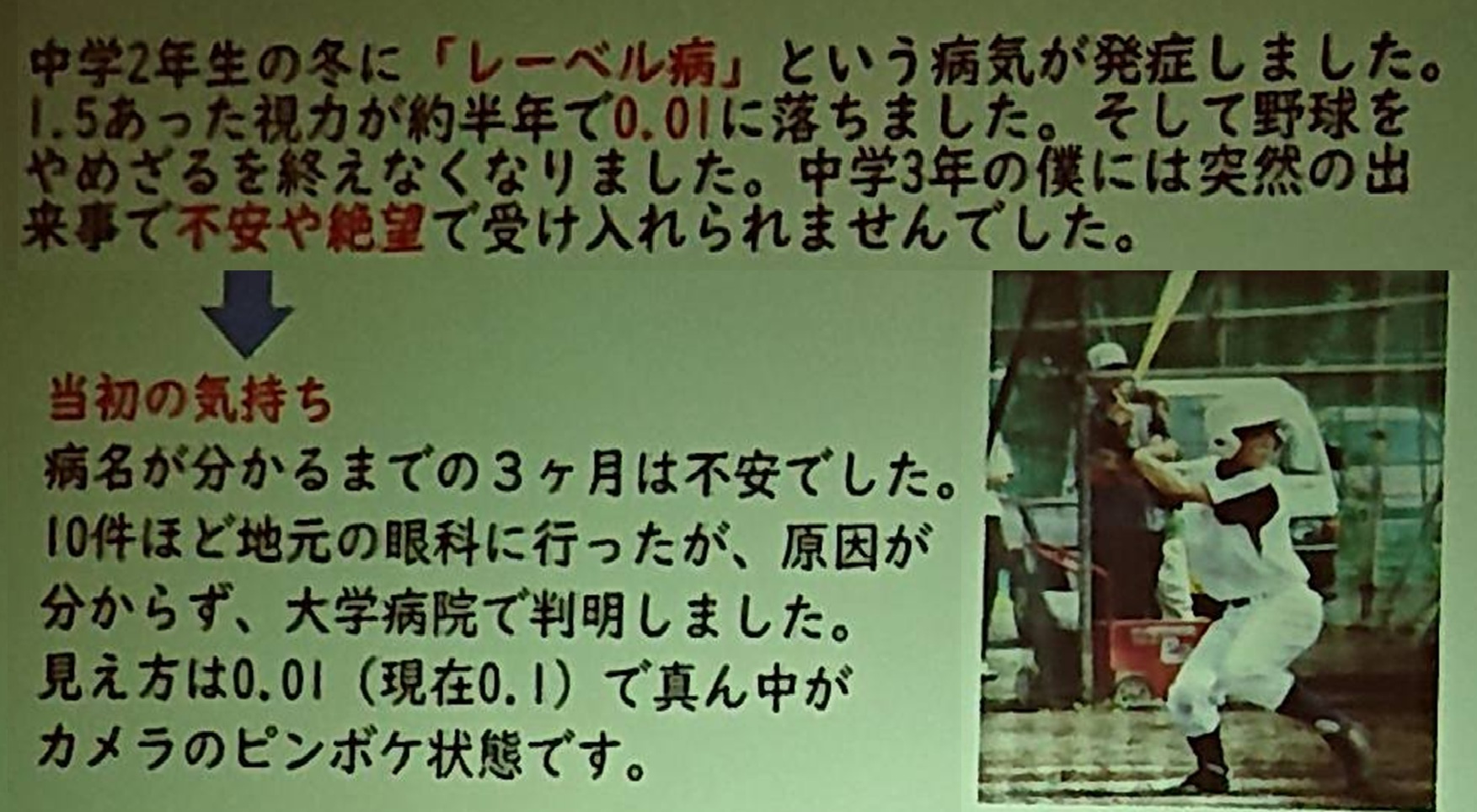 母親「視覚障がいの症状が出た後、それまで野球一筋で『野球以外はスポーツではない』と優人は思っていたし『優人からスポーツを取ったら、何が残るんだろう』と思った」。優人選手「当初は嫌々、障がい者スポーツを見学したが、体験してイメージが変わった。その後、川越の県立盲学校へ。卒票文集に将来の目標を『パラリンピアン』と書いた」。