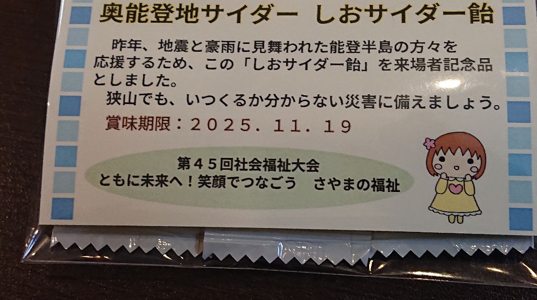 狭山市社協職員が『能登しおサイダー飴』を、入手してくれたと関係者から聴きました。飴ちゃん3個が来場者に配られたのですが、📷チラシを独自に作って入れたところが、丁寧。能登半島は『塩』の産地なので、皆さんに知られますね👍。