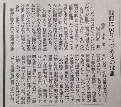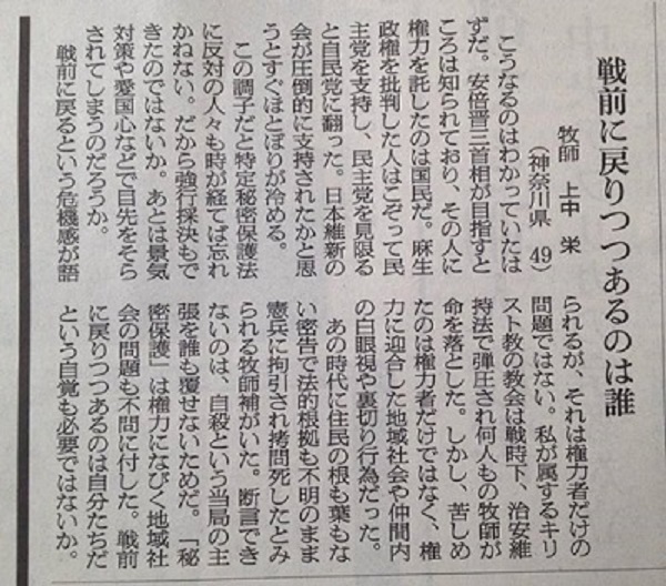12月12日朝日新聞の「声」欄。日本ホーリネス教団 上中栄氏の言葉です。