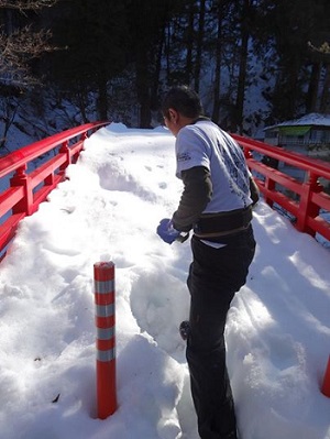 秩父・三峰のロープーウェイ乗り場(5年前に廃止)につづく橋を、雪かきした2月22日時点の写真。