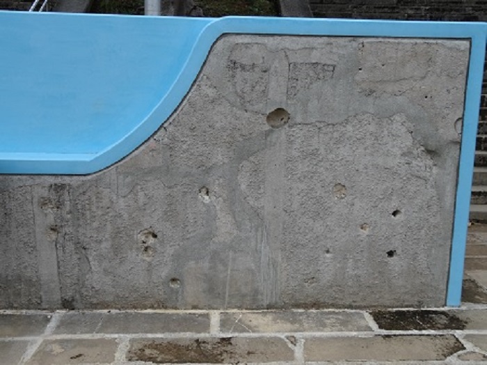米軍 普天間飛行場を一望できる嘉数(かかず)高台公園へ。この場所も、沖縄戦のトーチカ(鉄筋コンクリート製の防御陣地を指す軍事用語。特火点。)や壕が残っている。(現地への道すがら標識がいくつも出ています)