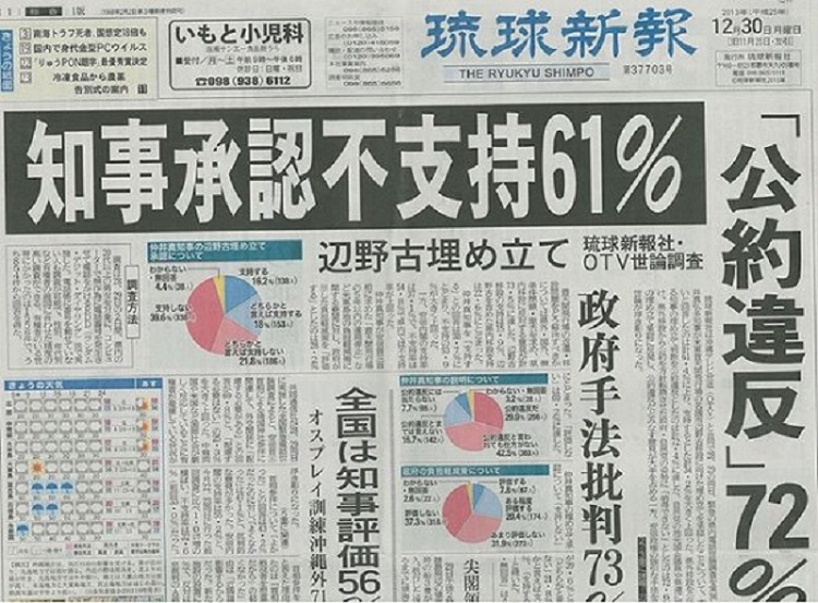 「辺野古への移設を知事が承認した事に、不支持の県民は6割」と報じる沖縄の地元新聞。