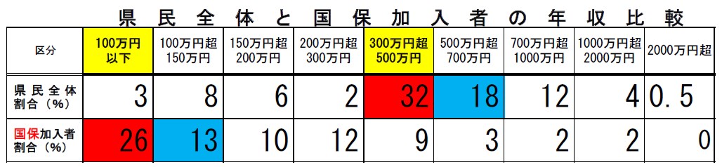 年収300万円以上の世帯は、県全体では50.8%ですが、国保加入者では、わずか14.6%。