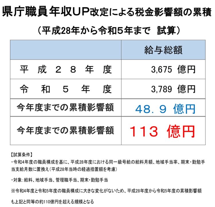 13、もし県庁が「財政難」と言われるなら、県庁職員の皆さんの年収は6年前と比べ、何度も改善され、合計48億9千万円増えています(上記資料⑦。人事課調査)。そして今年12月にも引き上げが審議されます。また、以前は県庁職員の60才~65才までの雇用は、現役時代の6割でしたが、7割に引き上げられました。